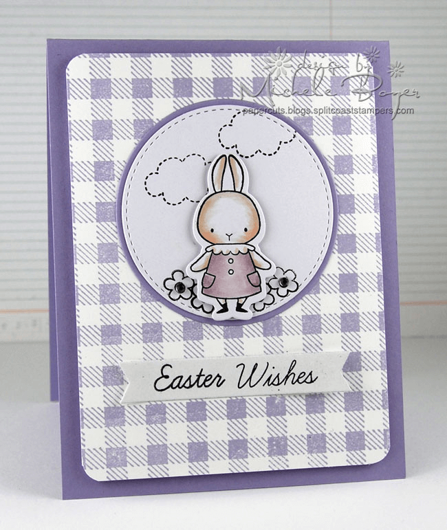 Lavender lovers, rejoice. This lavender-themed Easter greeting card from Michele Boyer is a great DIY project for beginner crafters, featuring a simple lavender and white background that you can embellish with a gingham stamp. The card’s focal points are made from die-cut cardstock and a bunny stamp that you can colour in with markers. Add a die-cut sentiment strip and add your custom greeting to complete the look.