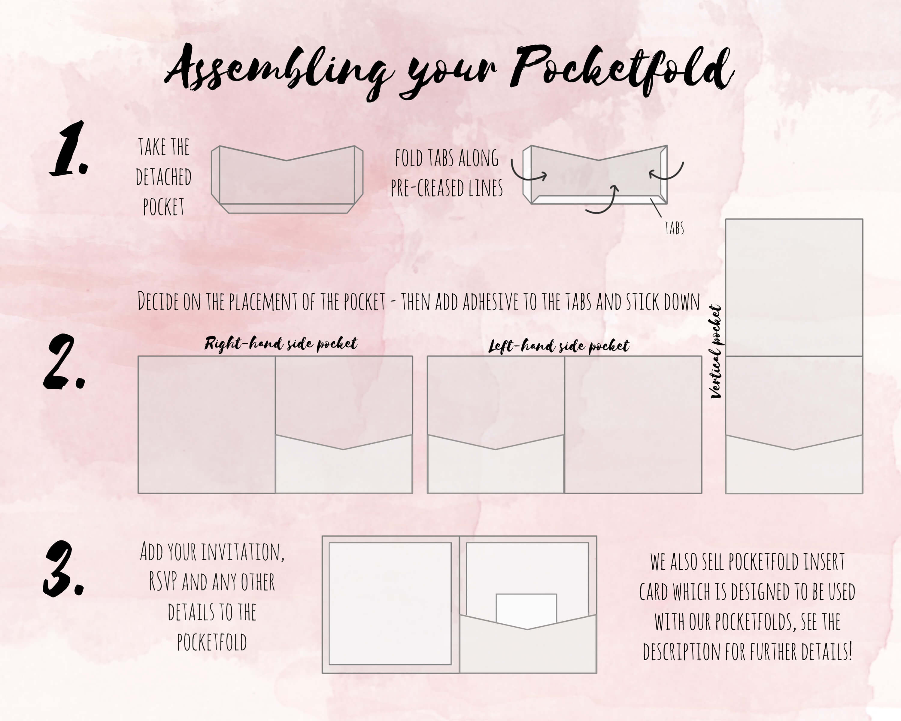 With these pocketfolds, the pocket placement is versatile, giving you complete control over the final look of your invite. The pocket can be placed on the left or right hand side, or at the bottom for a vertically opening pocketfold! Here's our handy guide to assembling your Pocketfold. If you would like to order from us you can find our pocketfold card invitations here and our pocket card inserts here.