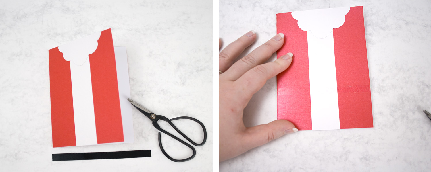 Use the tape runner to add two small amount of adhesive on the trim between the belt and beard and the belt and the bottom of the card for your buttons.
